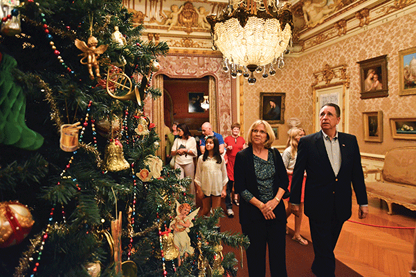 Each year during the winter holiday season, Whitehall's first floor is transformed into a Christmas wonderland with historically accurate greenery, trimmings, and ribbons. The focal point is a 16-foot-tall Christmas Tree in the Grand Hall, adorned with colored electric "fairy" lights and traditional Gilded Age-style ornaments. The home's exterior as well as the historic front gate are also decorated with festive wreaths, ribbons, and greenery.
